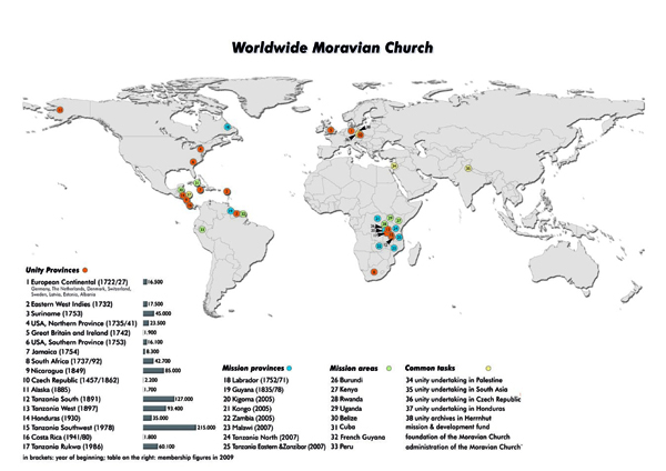 Światowa Jednota braterska (Unitas Fratrum) składa się z 18 autonomicznych prowincji, 5 prowincji misyjnych i 9 misyjnych regionów. Provincje pracują w czterech kontynentach. Aktualna liczba członków Unitas Fratrum jest taka: